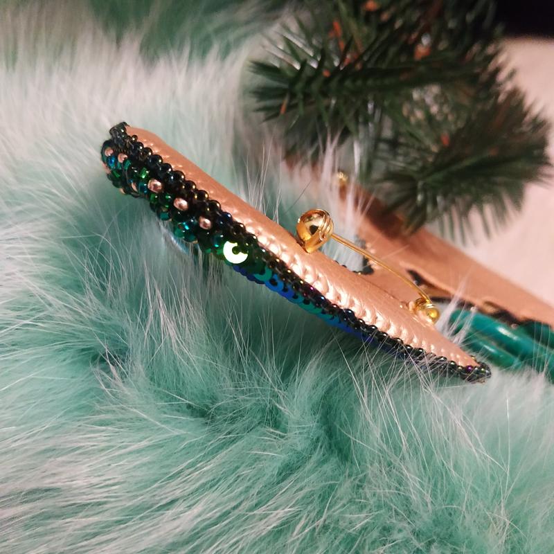 Яркий символ следующего года-зелений дракон. Украшение ручной работы в едином экземпляре. Изготовлена из полимерной глины, чешского и японского бисера, пайеток и стразовой цепочки. Размер брошки 12*8 см.