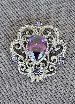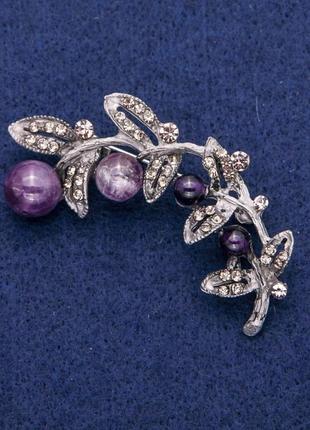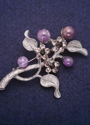 Брошь веточка с цветами в кристаллах и аметистом, серый металл 45х59мм