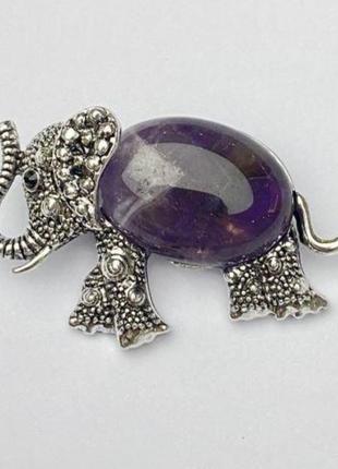 Брошь-кулон слон с натуральным камнем аметист, серебристый металл 40х25мм+-