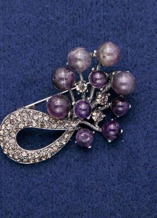 Брошь с бусинами аметист и серыми стразами 43х58мм, темный металл