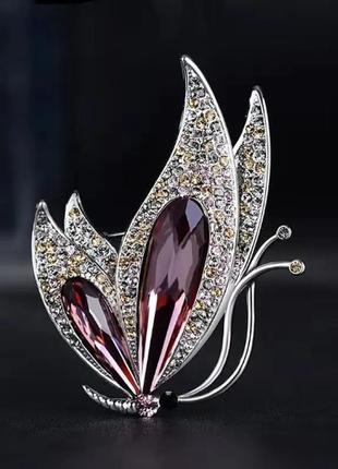 🦋 брошь бабочка с удлиненными кристаллами, серебристый металл