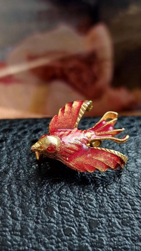 Милая и очаровательная брошь Птица. Металл золотого цвета с роскошной красной эмалью. Очень хорошее винтажное состояние, без повреждений. Размер: 2,5×2 см. Вес : 3 гр. Не марковано.