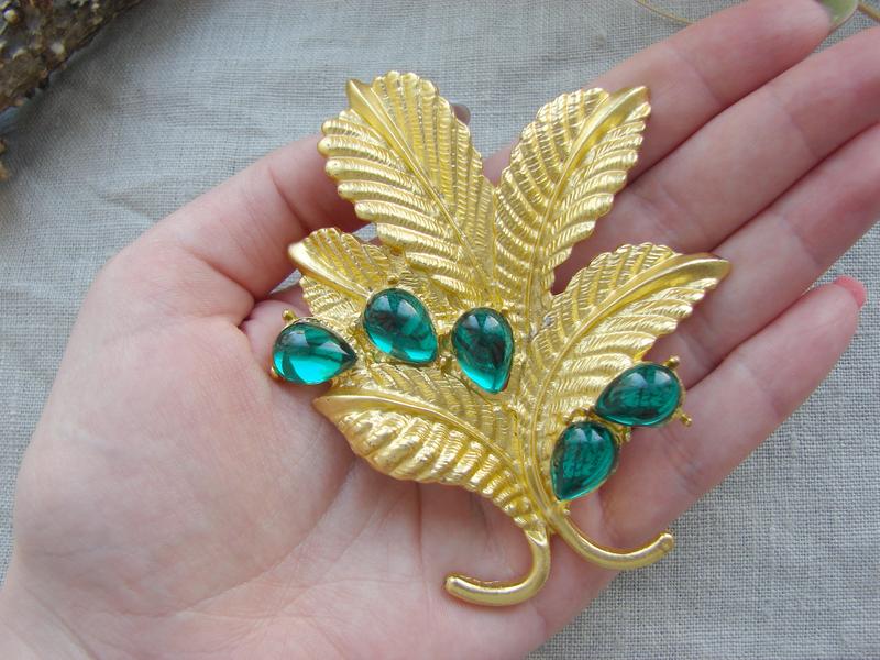 Большая брошь с листями крупная золотистая брошка листья с зеленым в винтажном стиле