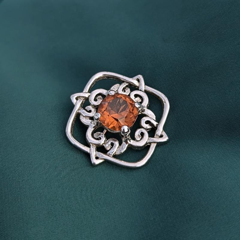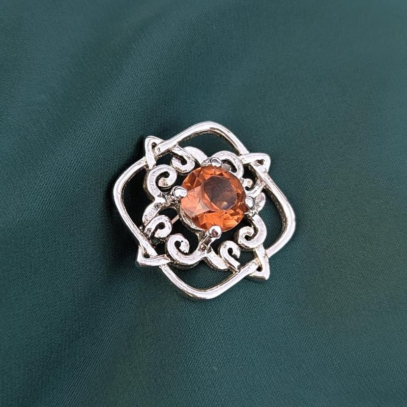 Украшение выполнено из металла серебряного тона, стеклянная вставка коньячного цвета.Хорошее винтажное состояние.