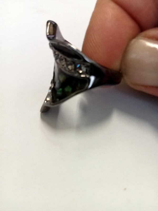 Винтажное кольцо необычной формы, 18 р-р. Покрытие родиевое под черненое серебро. Высота в самом широком месте 29мм. Чёрная эмаль с зеленью. Украшено фианитами.