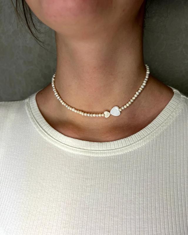 Натуральные речные жемчуги, диаметр 3-4 мм Натуральный Перламутр Сердечки 6 и 12 мм Объем ожерелья 38 см Акционная цена до 3.11.23