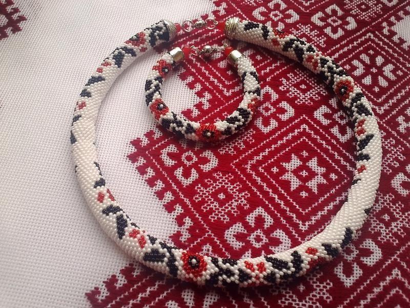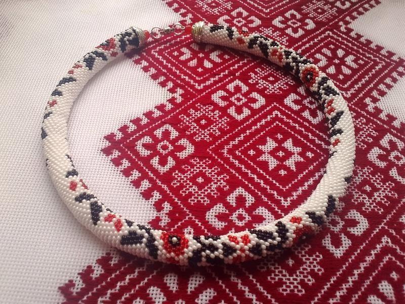 Джгут з якісного чеського бісеру та металевої фурнітури під срібло, дуже зручна магнітна застібка. Цей джгут, виконаний у етно стилі за схемою Olga Sokoliss, може стати як Вашою улюбленною прикрасою, так і чудовим подарунком. Довжина джгута - 51 см, діаметр - 13 мм (15 бісерин у колі). До джгута є браслет, його можна придбати з джгутом або окремо, вартість браслету - 275 грн. За бажанням покупця можу зробити сережки до комплекту.