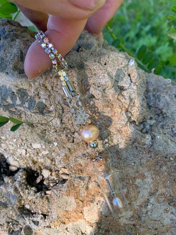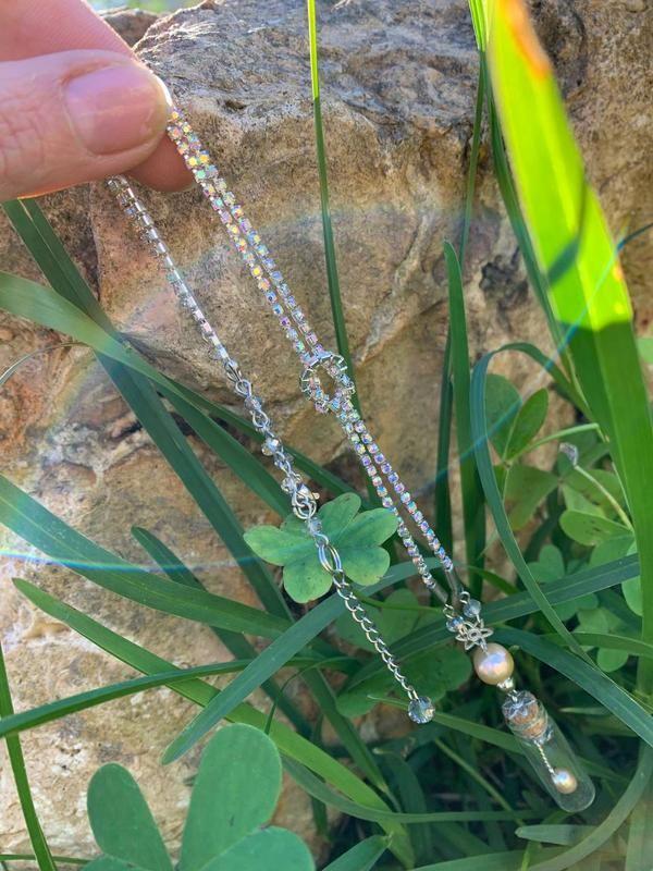 Нежный авторский комплект (цепочка и подвеска-бутылочка) ручной работы из стразовой цепочки и натурального пресноводного жемчуга. Длина стразовой цепочки по шее 33-36,5 см, носится на самой шее, как чокер без подвески. Длина общая подвески 14 см, бутылочка размером 11 х 40 мм с пробковой крышечкой, открывается. Подвеску можно носить на другой цепочке, повесить на сумку или на ключи. Фурнитура - нержавеющая сталь и бижутерный сплав.