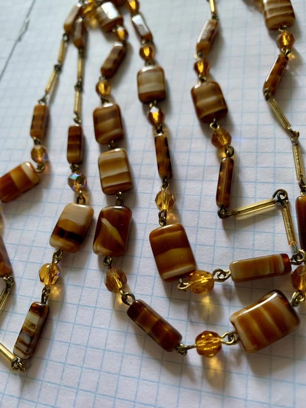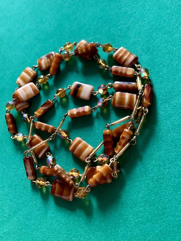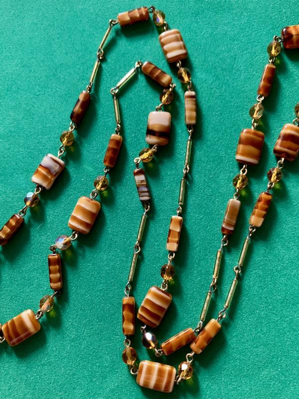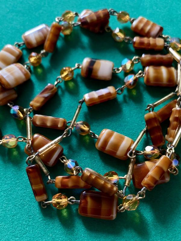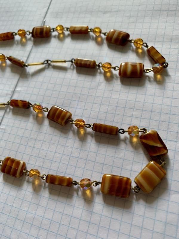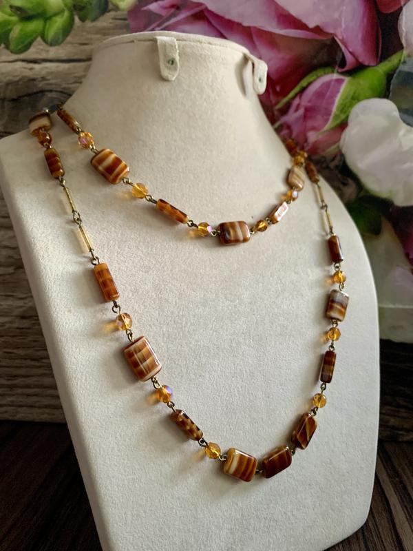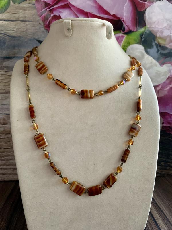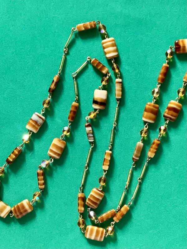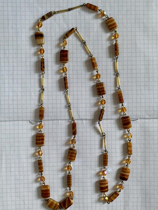 Материал: латунь с позолотой, художественное стекло, граненое стекло с покрытием Aurora Borealis.Длина: 100 см, одевается в 2 раза из-за головы, но можно по желанию поставить застежку