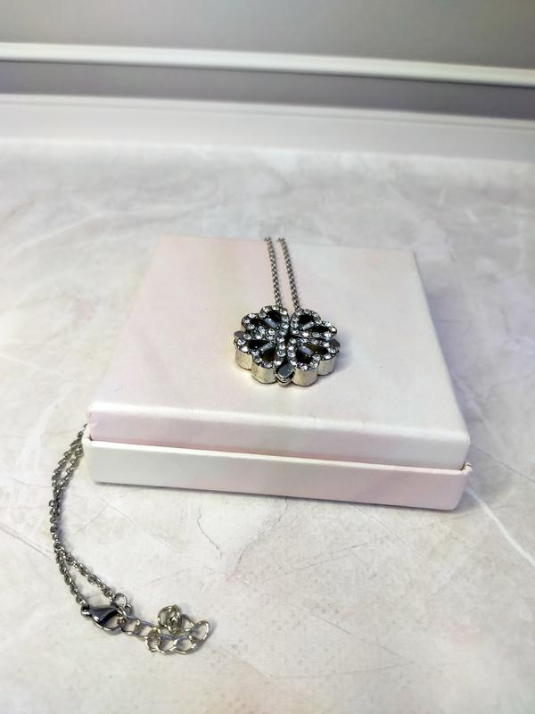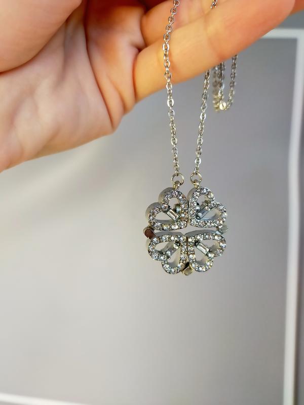 Необычное колье трансформер. Можно носить как колье, но есть магниты и они превращаются в кулон цветок.клевер, четырехлистник. С кристаллами. Длина -58+4см