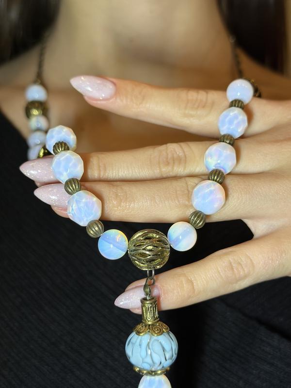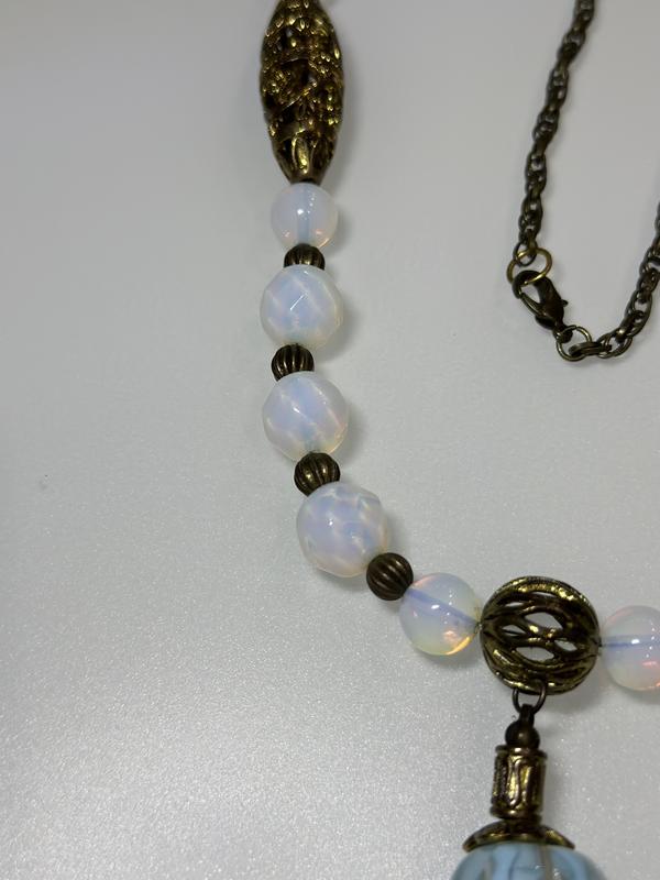 Бусы из натурального лунного камня, выполненного в Тибетском стиле и кулон из муранского стеклаРазмер: 75см (присутствует возможность укоротить)