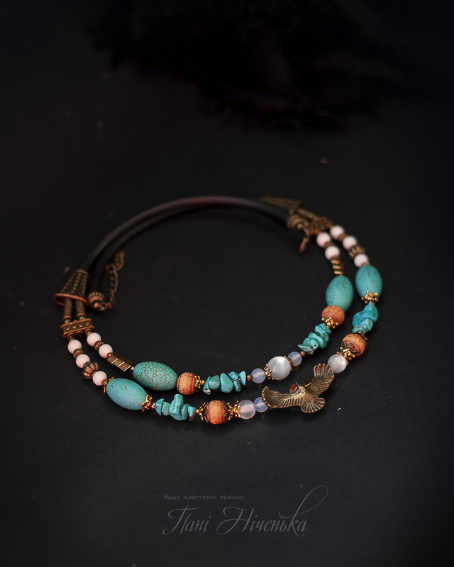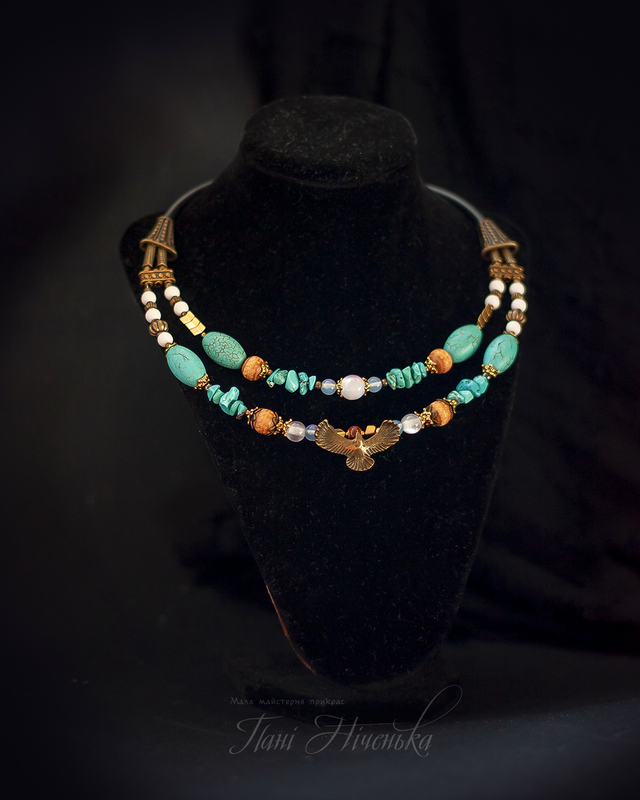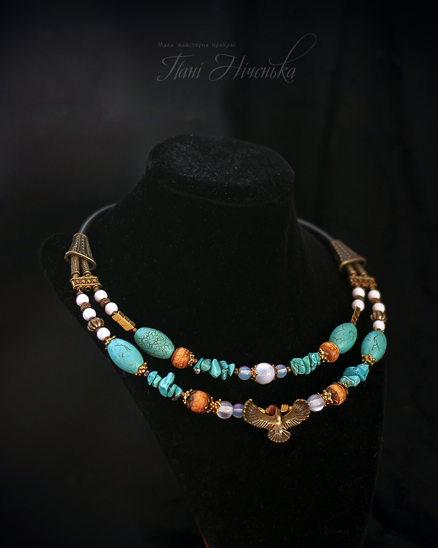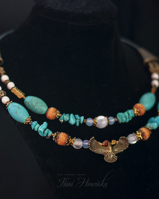 Орел - символ отваги и смелости, настоящей гордости и красоты. Огромный нрав увидеть этой гордой птицы. И я ни минуты не сомневалась, с каким цветом совместить эту замечательную сгарду. Точно голубой! Бескрайние небо (говлет, имитация драгоценной бирюзы), слотистые колосики гематита, деревянные бусинки с этно-разбавлением - такой танец оттенков и символов слагался.