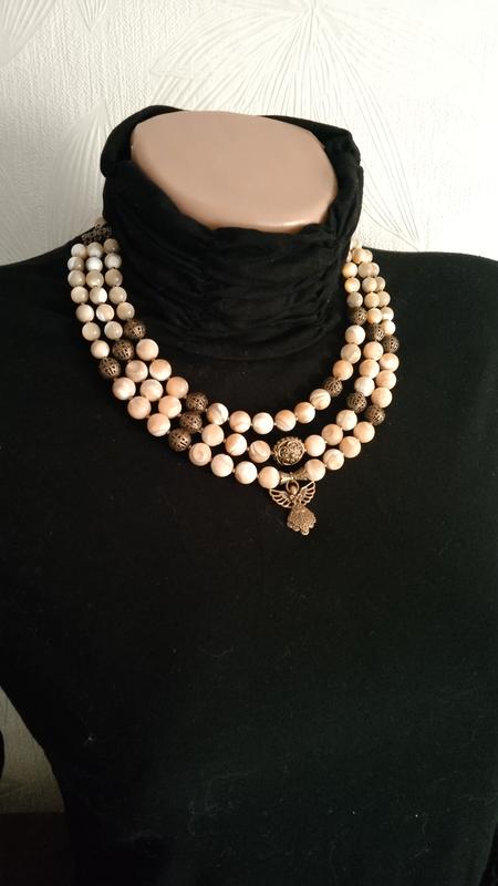 Трехрядное ожерелье из бусин из ракушки, баламутов, кулон ангел. Длина от 46см., бусины 8-10см. Серьги в подарок.