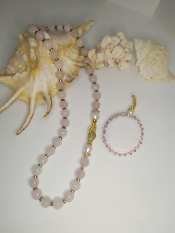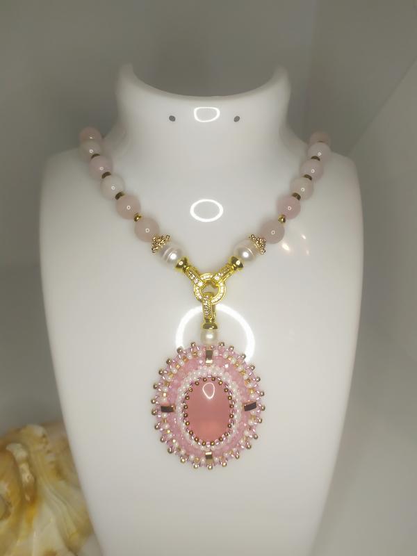 Матеріали: намистини рожевого кварцу 8 мм, річкових перлів 8мм, гематиту; фурнітура - Преміум класу з фіанітами, латунь з позолотою 24К; кабошон рожевого кварцу, чеські скляні елементи, чеський бісер, натуральна шкіра.
