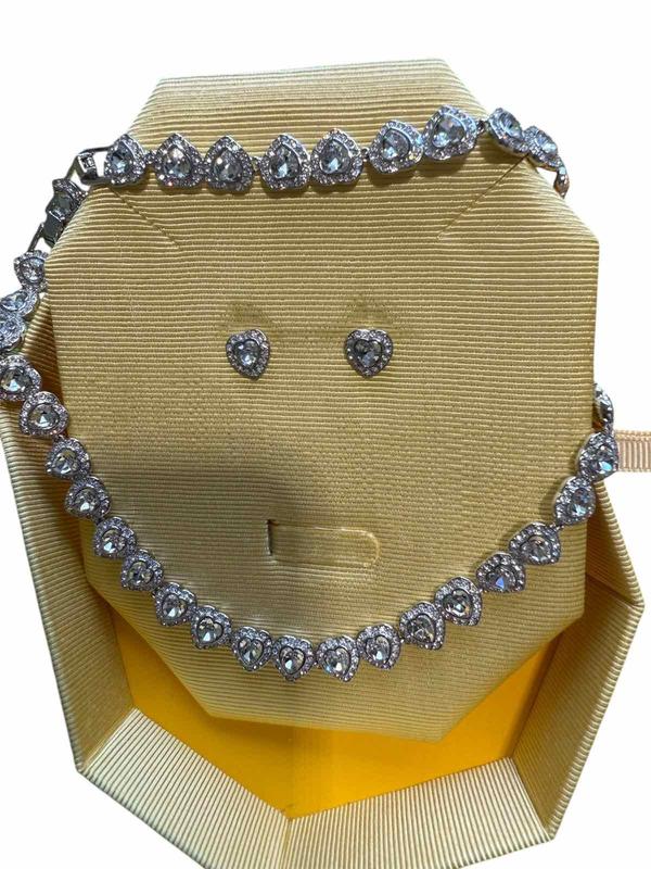 Это изысканное украшение создано из прозрачных кристаллов в форме сердца, каждый из которых деликатно обрамлен блестящей оправой из дрave-кристаллов, подчеркивая безупречное мастерство бренда Swarovski. Выполнено с покрытием родием, ожерелье смотрится стильно и в то же время классично элегантно. В набор входит колье, браслет и серьги. Колье 4600, браслет 2800, серьги 2000. Набір мінус 10%.