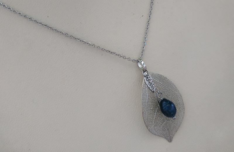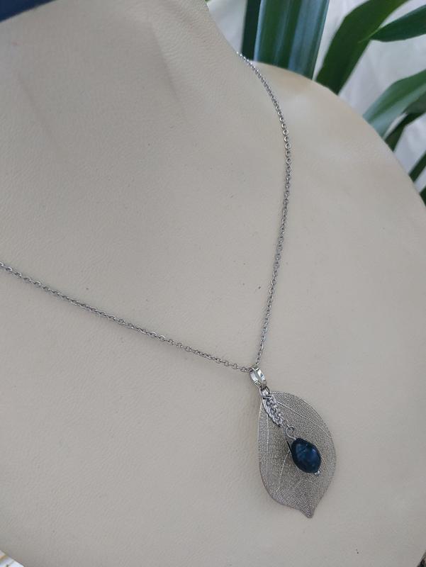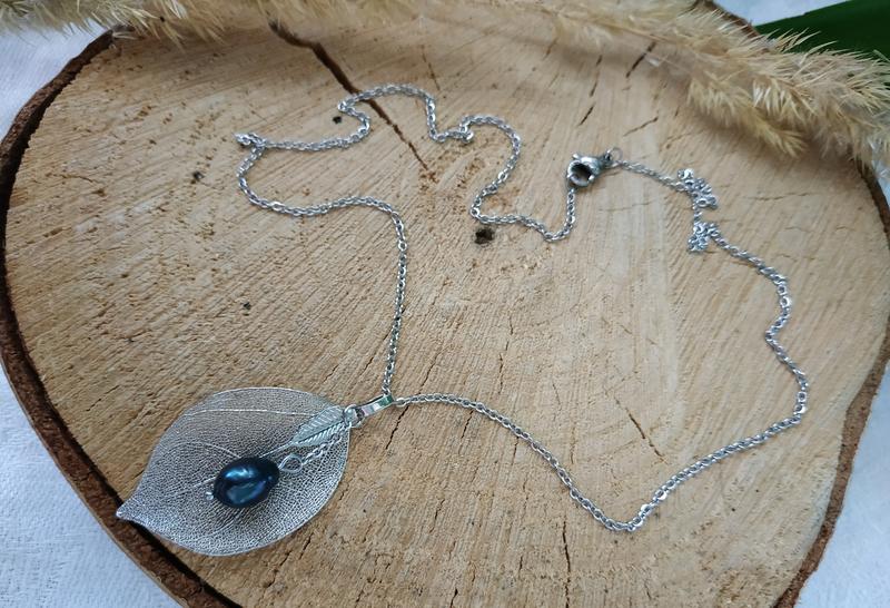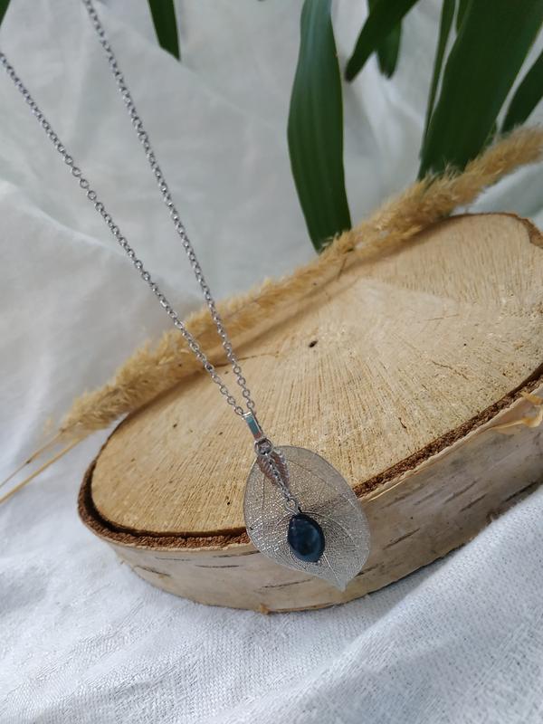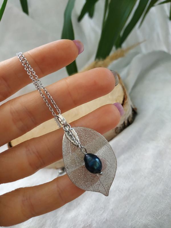 Обратите внимание на эту тонкую цепочку с подвеской - филигранным листиком с натуральной пресноводной черной с серо-синим отливом жемчужиной (6х9мм) на фурнитуре из ювелирной нержавеющей стали. Длина цепочки 45 см, размер листика 2,4х4 см