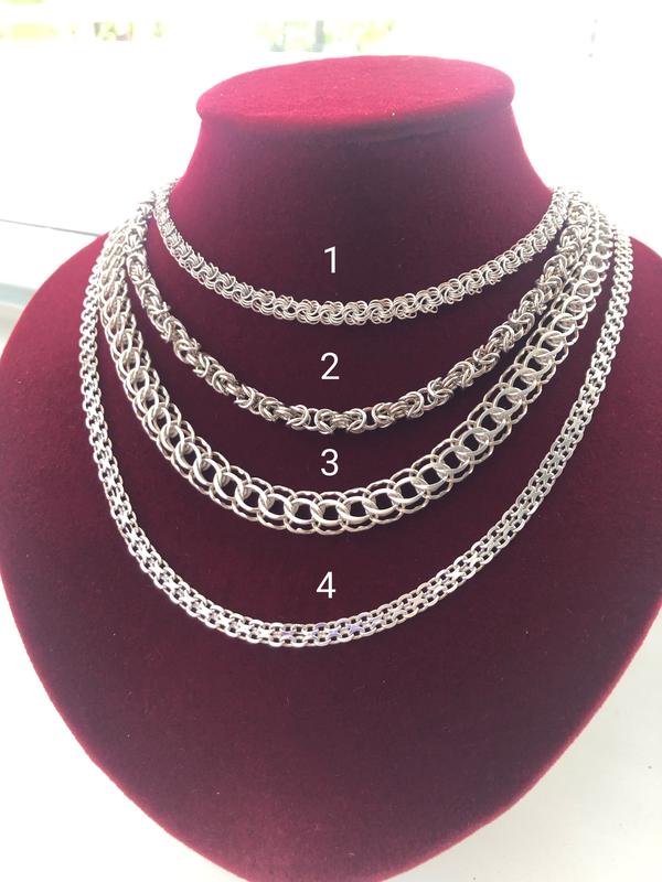 Серебряные цепочки 925 проба1. Длина изделия - 55 см, вес - 16,7 гр. - 2337 грн.2. Длина изделия - 60 см, вес - 52,5 гр. - 7300 грн.3. Длина изделия - 60 см, вес - 50,45 гр. - 6555 грн.4. Длина изделия - 57 см, вес - 17,39 гр. - 2455 грн.