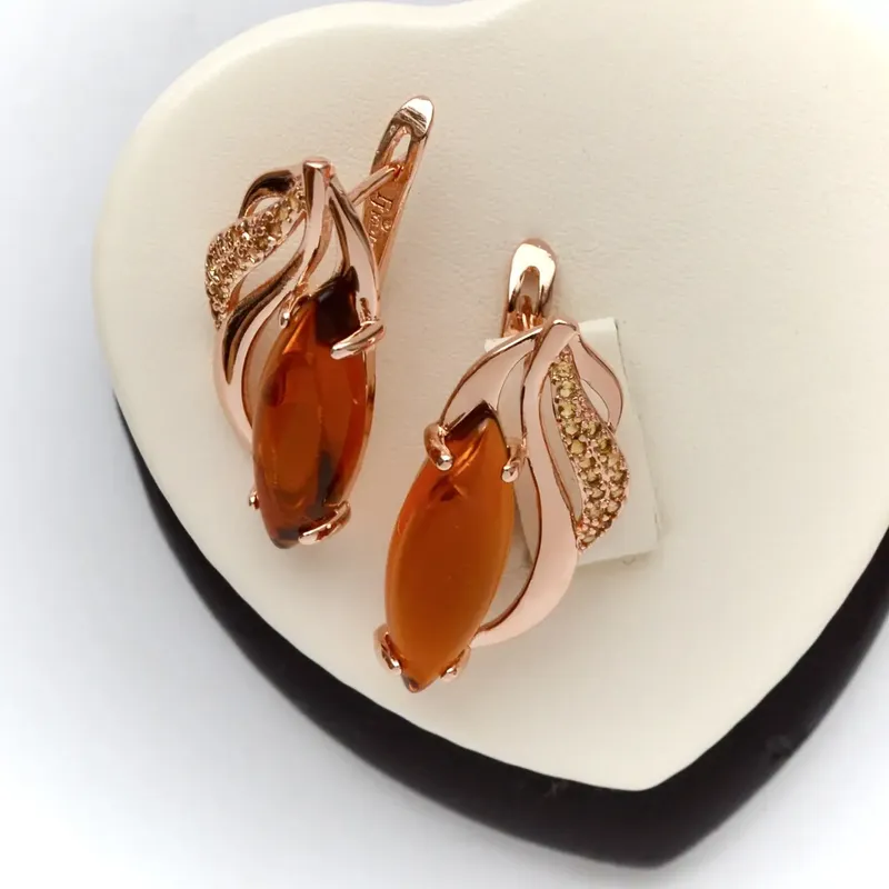 Покрытие: розовое золото. Размер: 27 х 13 мм. Вставка: янтарные кристаллы Вид камня/вставки: искусственный Изделия не боятся воды и красиво носятся