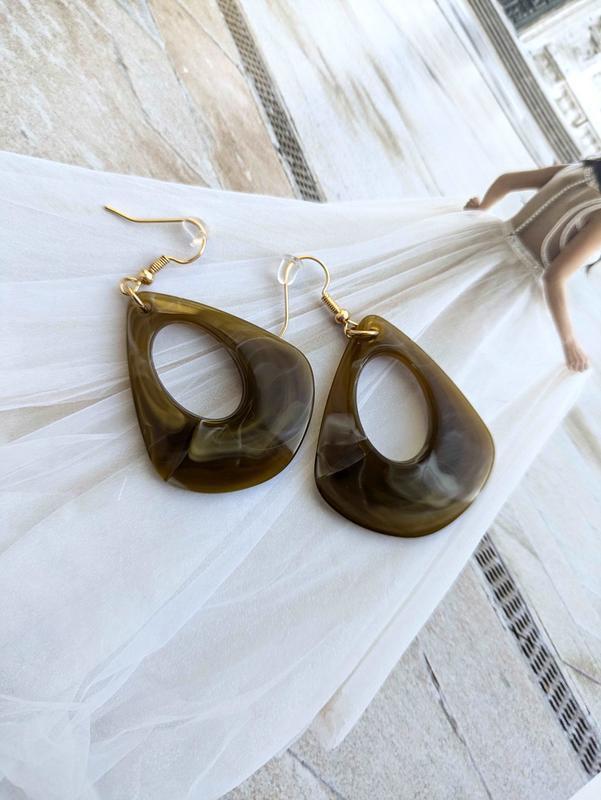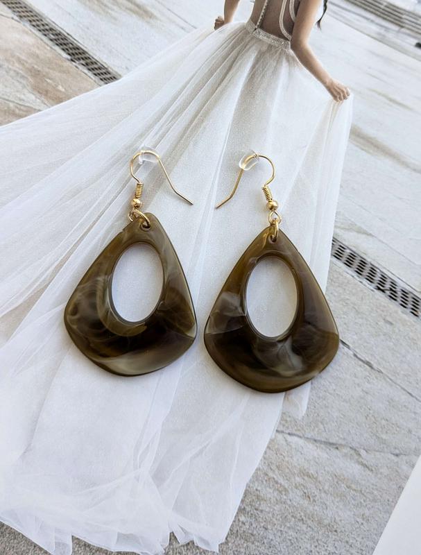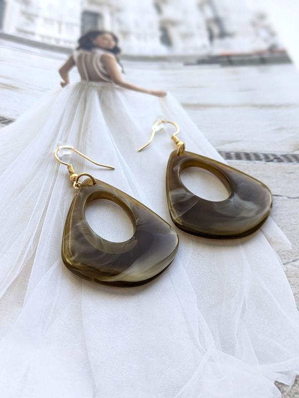 Красивые серьги в трендовом коричневом цветеМатериал акрил, застежка металлПолная длина 6,2 см ширина 3,5 см
