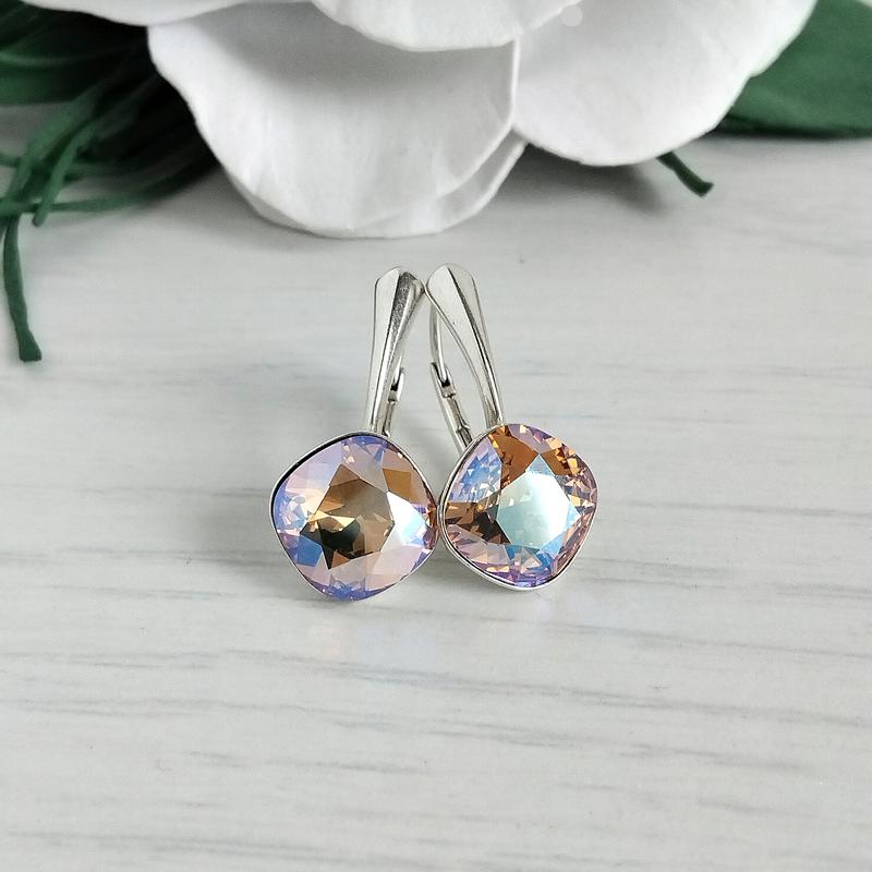 Серьги ручной работы с оригинальными кристаллами Сваровски в бриллиантовой огранке. Цвет кристаллов - Colorado topaz Shimmer - красивый оттенок в медовых тонах (поверхность кристалла полностью покрыта разноцветным светоотражающим слоем). Кристалл постоянно разный! На фото мах пытались передать оттенки. Размер кристалла 10×10 мм. Длина серьги примерно 23 мм. Фурнитура производства Евросоюза высокого качества из серебра. Замок - французский до щелчка, держит крепко и надежно.