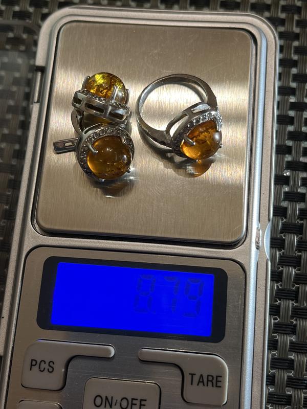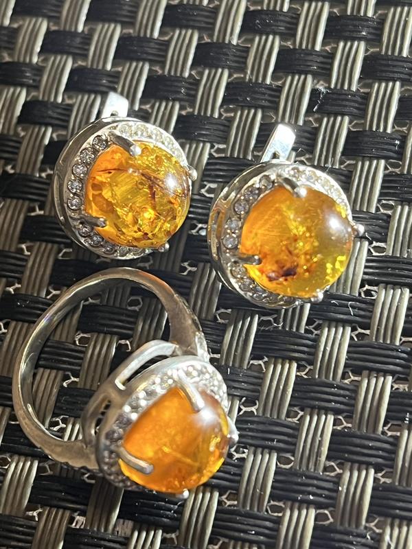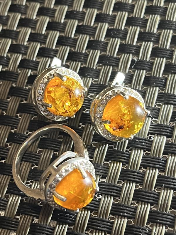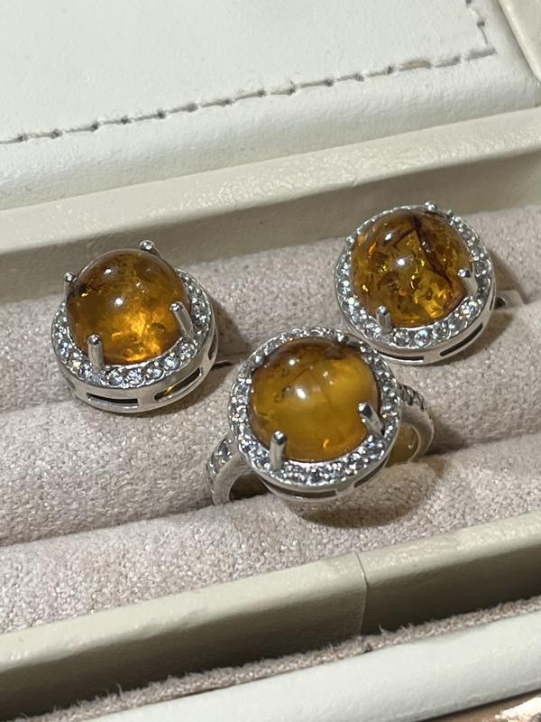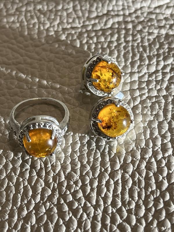 Изысканный, стильный серебряный гарнитур из янтаря. Каблук размер 16. Янтарь еще называют солнечные камни - оказывает очень положительное влияние на человека. Бирочки не сохранились. Проба 925