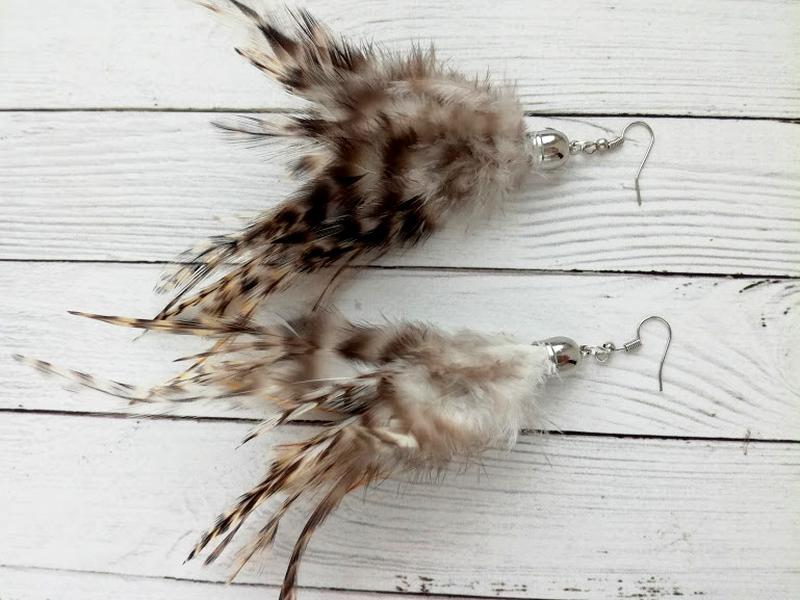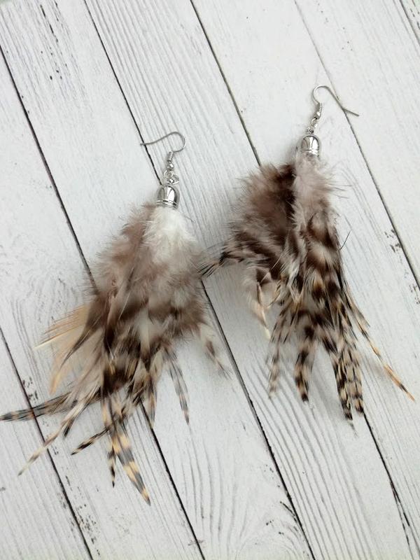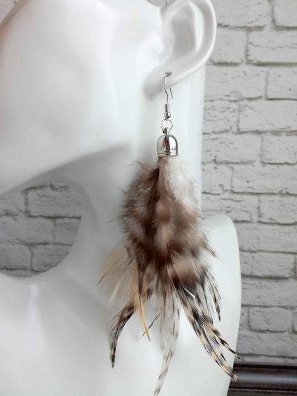 Эти необычные серьги сделаны из очень легких натуральных перьев петуха. Перья имеют полосатый окрас коричнево-серого цвета. Сережки украшены металлическими колпачками серебряного цвета. Крепятся серьги на швензы-крючки из нержавеющей стали.
