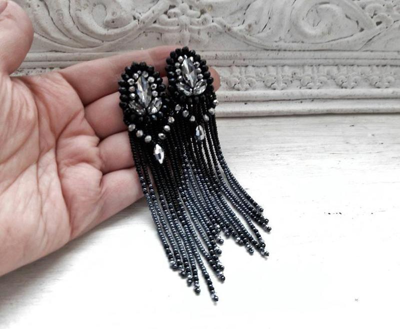 Стильные черные серьги из бисера и хрустальных бусин с бахромой.