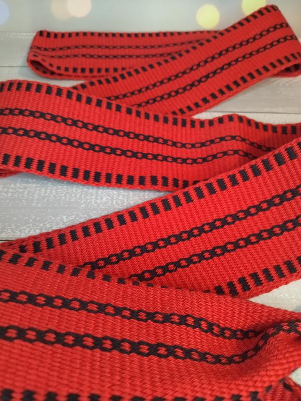 Кромка из традиционных украинских цветов, которые наши предки издавна использовали в тканице и вышивке. Красный - то любовь, а черный - то земля - плодородная и животворная! Длина тканой части 260 см + кисточки, ширина 6,5 см. Изготовлена из 100% хлопка на ткацком станке.Подходит не только с вышиванками, но и любыми платьями.