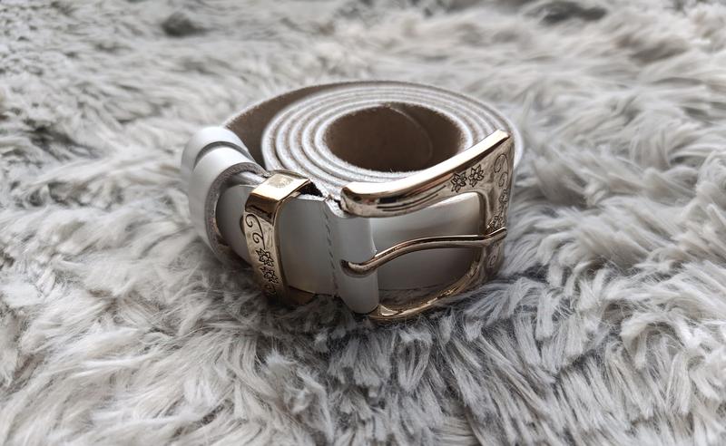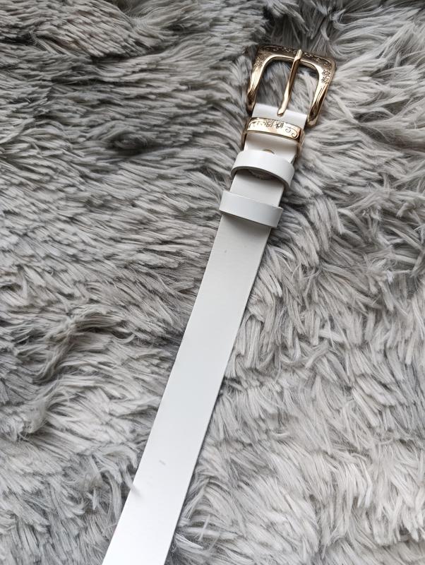Красивый женский ремень.Эко кожа.Цвет - белый.Пряжка золотиста.Ширина и длина (включая пряжку) указаны на фото.