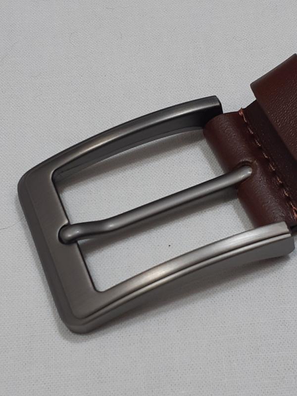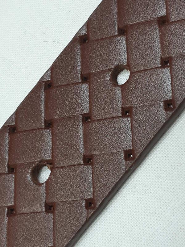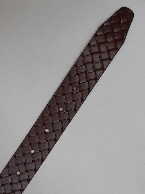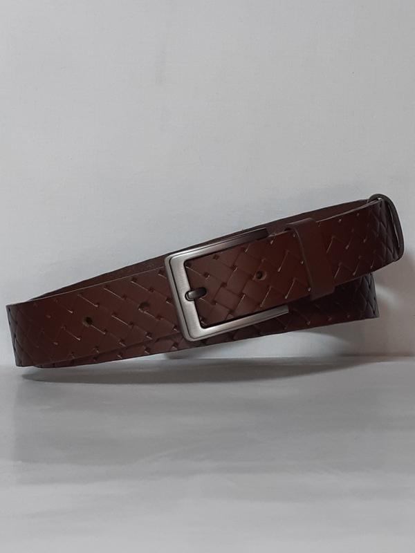 Красивый брючный коричневый ремень класса «унисекс» с текстурной («плетёнка») полосой из натуральной кожи. Пряжка классического типа серии 35-1 полуматовая силуминовая с гальваническим покрытием «титан». Толщина кожаной полосы 3,2 мм». Ширина ремня 33,7 мм (под пряжку с проёмом 35 мм); длина ремня 125 см (на объём до 110 см).