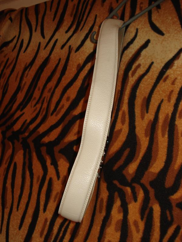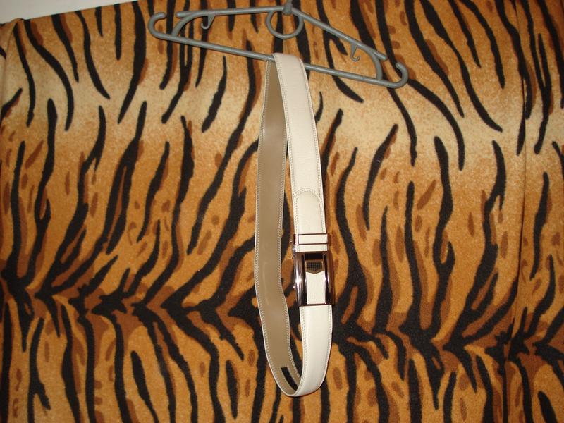 Шикарный ремень из светло-бежевого кожзама,внутренняя сторона-темный беж,фирменный,стильный,чудная пряжка-автомат,длина ремня-97см.