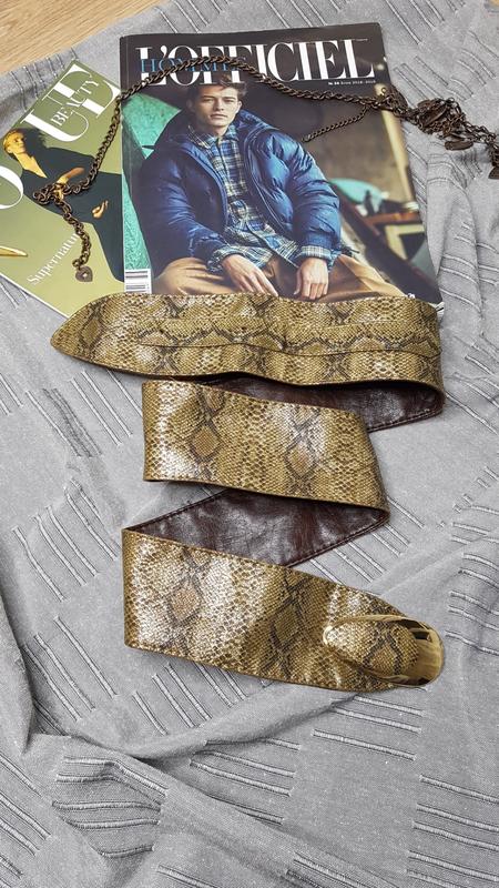 Широкий пояс в анималистичный принт 🐍. Прекрасно подойдет к платью, на пиджак или верхнюю одежду. Большая золотая пряжка. На талию/пояс от 82 см до 99 см. Материал кожзам. Состояние прекрасное. Замеры:Длина - 110 смШирина - 6,3 см