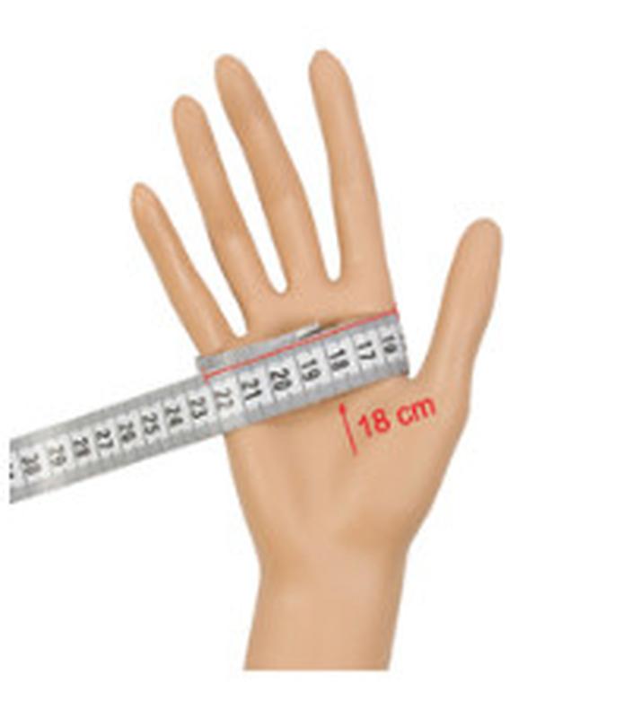 Для того что бы узнать свой размер перчаток, необходимо измерить диаметр ведущей руки. У левши левая рука будет всегда немного больше, так как у правши -- правая. Берем метр и оборачиваем его вокруг ладошки без большого пальца, в самой широкой части ладони (как показано на рисунке). Метр туго не затягиваем, но и не даем ему провисать. Это и будет идеальный размер в сантиметрах, соответствие которому можно узнать из таблиц международных значений.