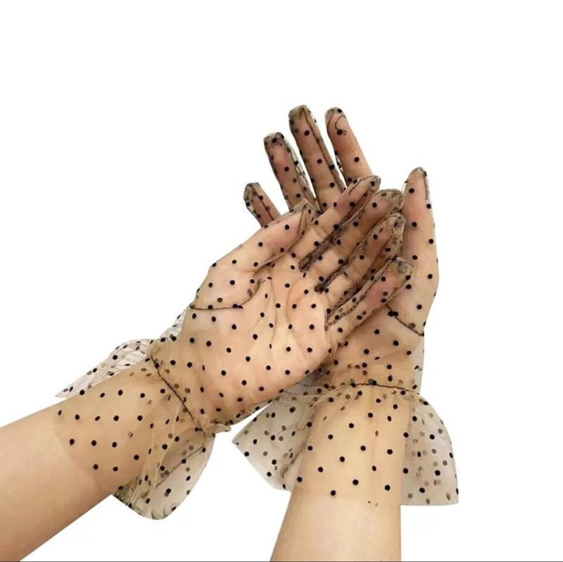 Перчатки короткие фатиновые, фатин, коричневые в черный горох