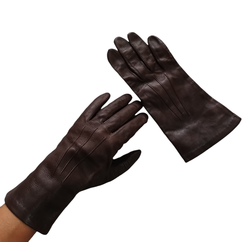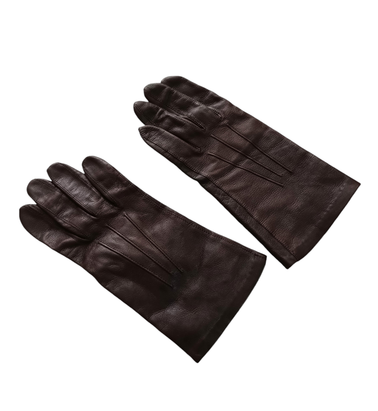 Перчатки из 100% кожи, подкладка 100% шелк. Внутри одной перчатки есть пятно от этикетки (последнее фото). Длина - 23,5 см, полуобхват ладона - 9 см.