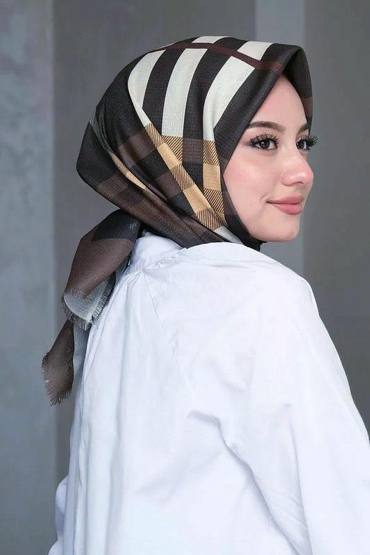 В отличном состоянии женский платок большой из качественного тонкого хлопка выполнен в оливковом оттенке с геометрическим орнаментом. Первое фото с сайта данного бренда. Размер 98на98 см.