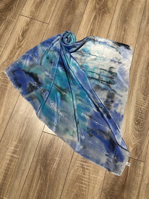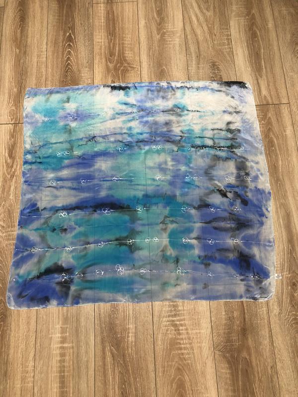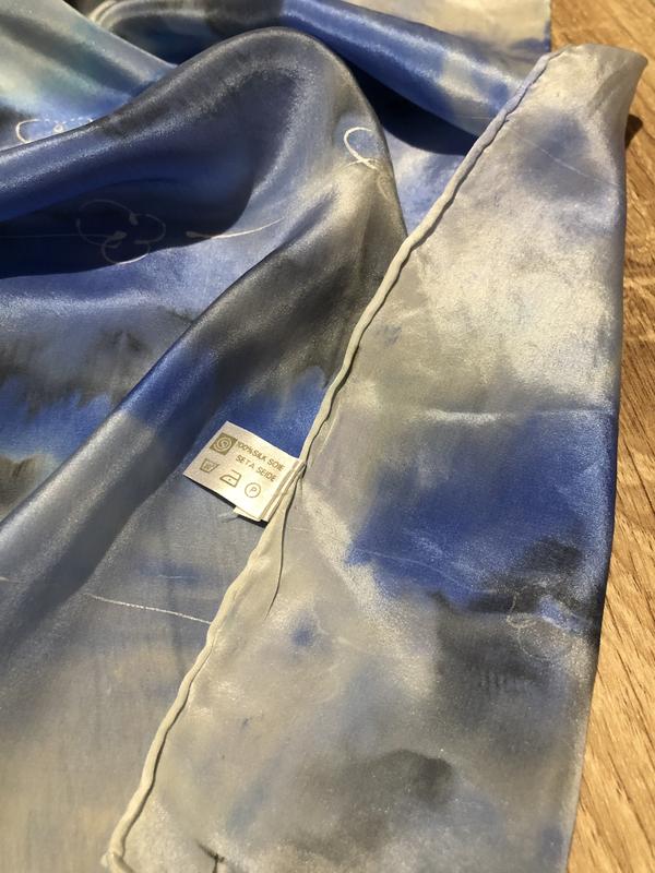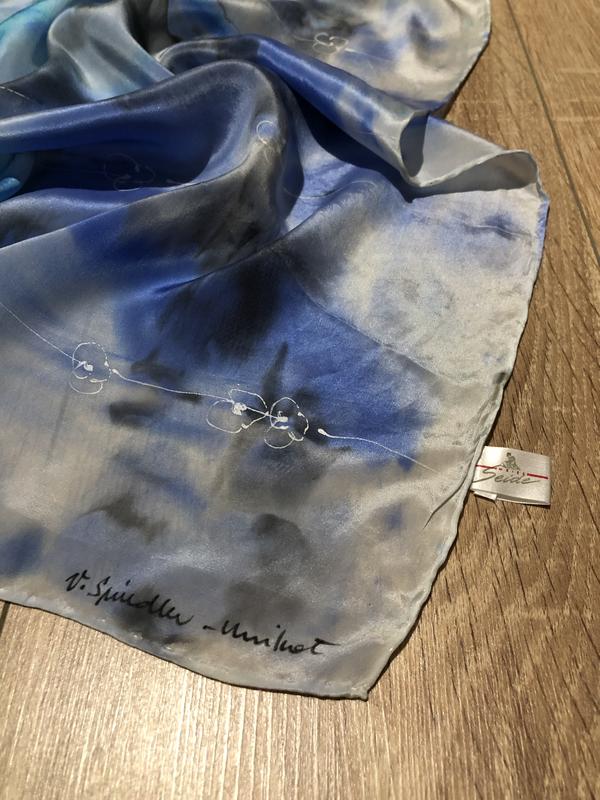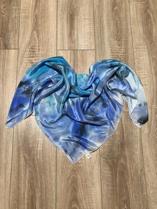 Дизайнерский нежный шелковый подписной платок Meier SeideВоздушный 100% натуральный шелк, очень нежный. Эксклюзивный принт, ручная работа и отделка края.Состояние абсолютно идеальное, размер 91*84 см.