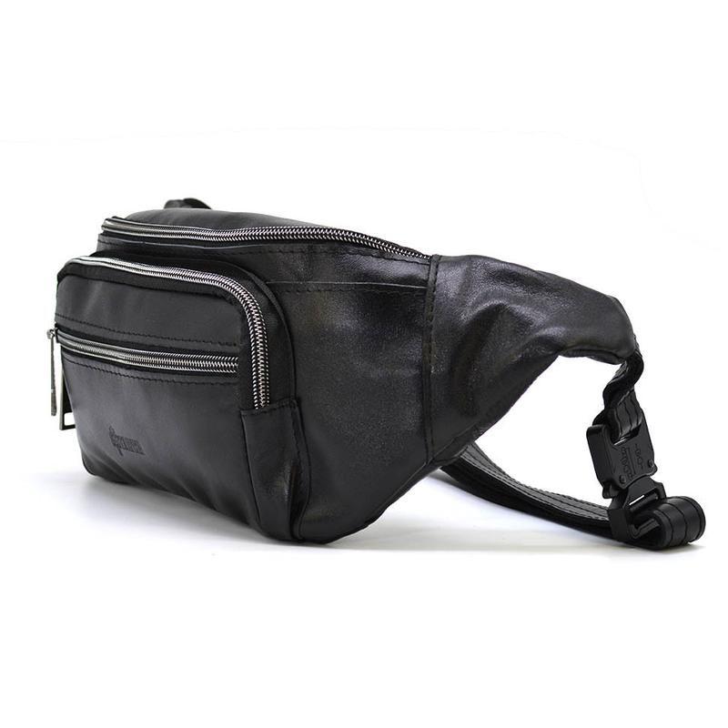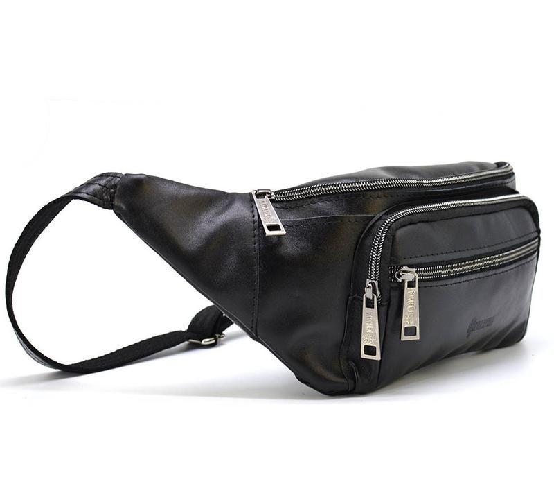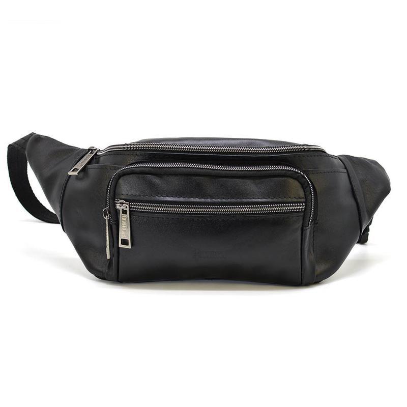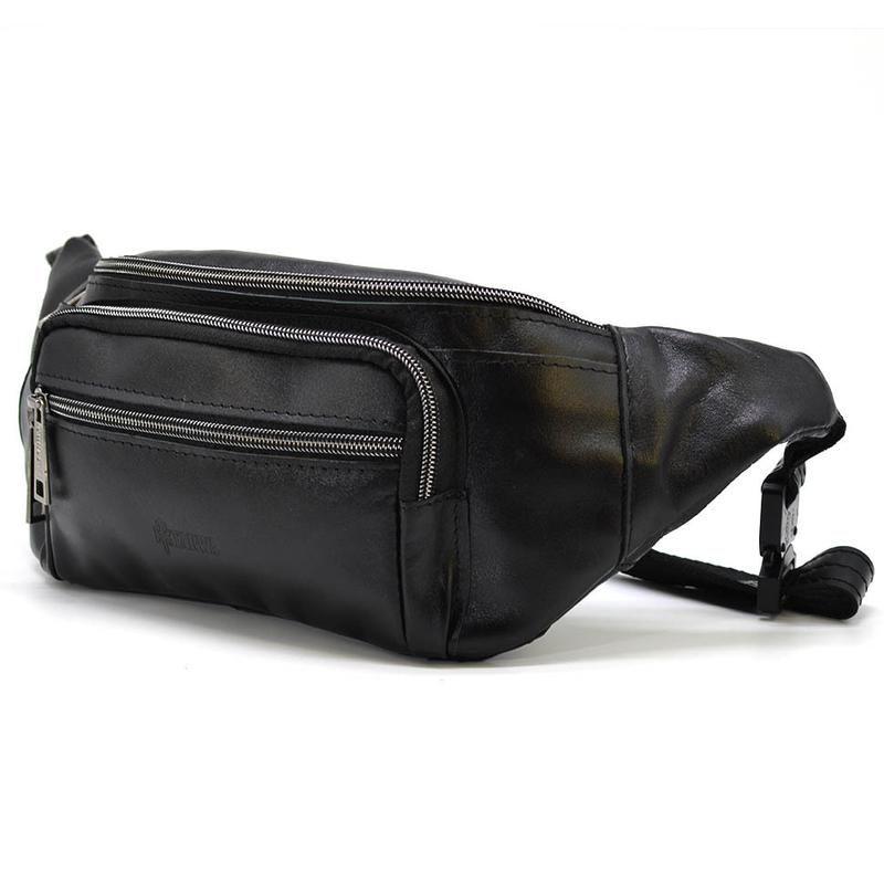 Бананка кожаная, сумка напоясная черная большая TARWA GA-7219-3md. Сумка имеет два больших основных отделения, передний накладной карман на молнии и передний плоский карман на молнии. Полностью кожаный напоясный ремень и металлический фастекс.