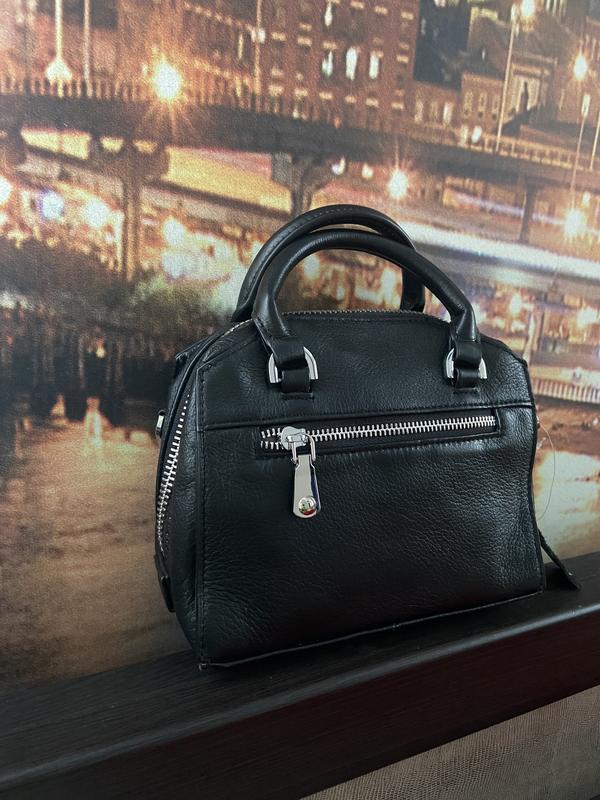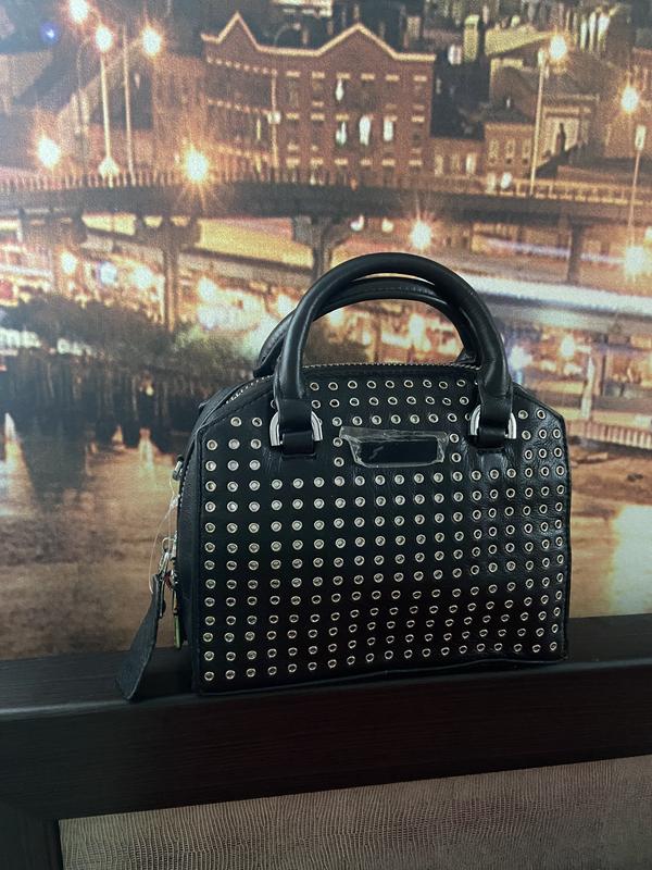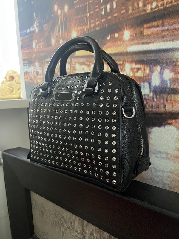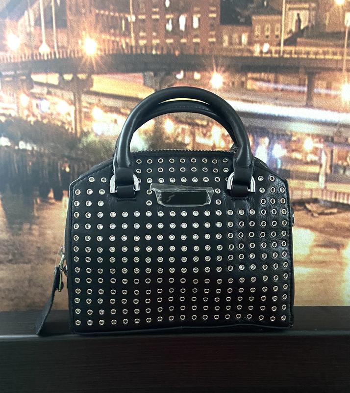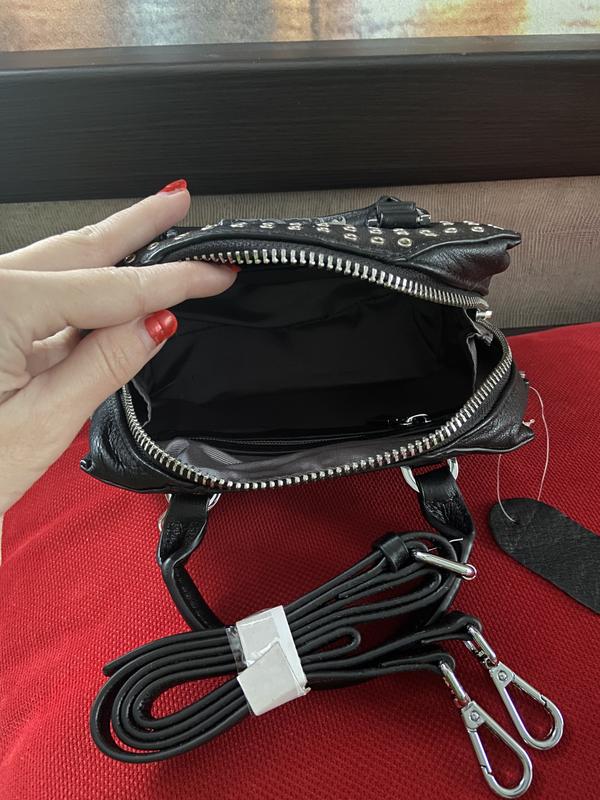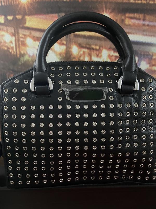 Сумка насыщенно - черного цвета с качественной фурнитурной серебряного цвета, на лицевой стороне изделия заклепки.