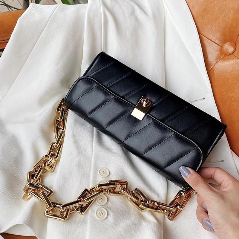 Код: V801 Женская сумочка клатч на толстой цепочке черного цвета. Имеет один отдел и качественную золотую фурнитуру. Цепочка пластиковая, не тяжелая. Параметры - высота 11 см, длина 23 см, ширина 6 см, длина цепочки 55 см