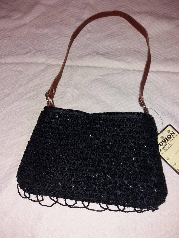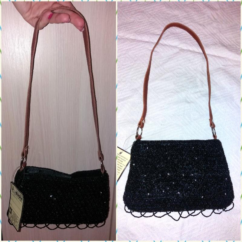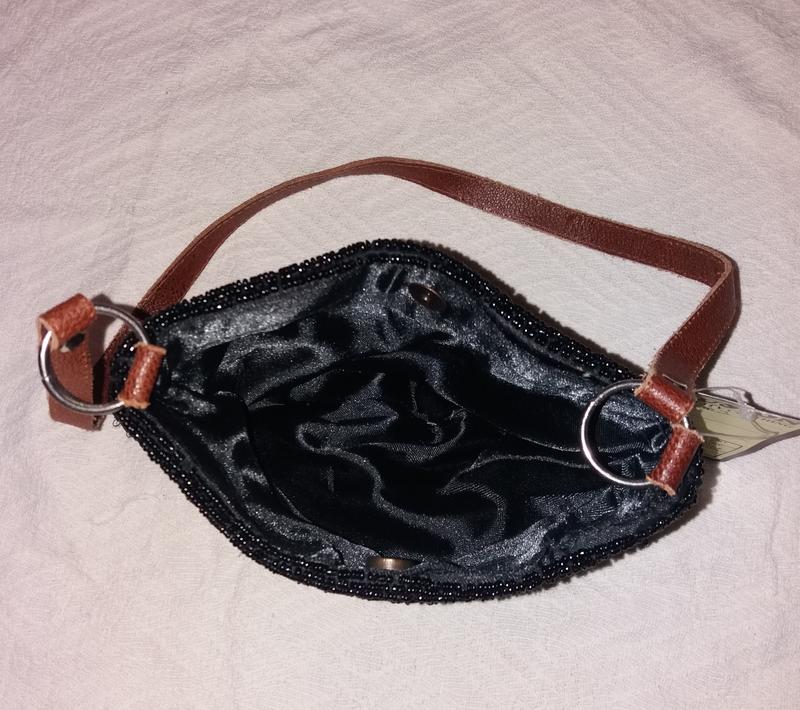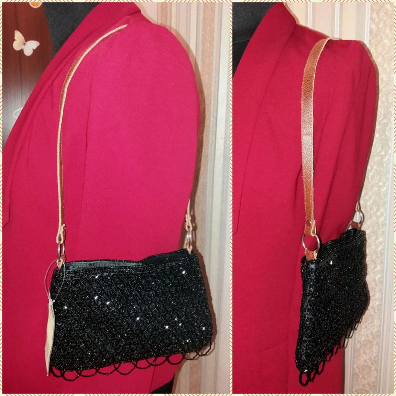 Маленькая сумочка, обшита бисером, застегивается внутри на кнопку магнит, на кожаном ремешке. Ткань атласная.