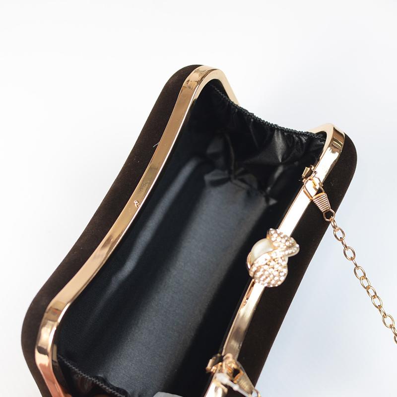 Миниатюрная, компактная сумочка (клатч-бокс). Одно отделение, которое закрывается защелкой. Можно обойтись и без цепочки — благодаря своим небольшим размерам сумка-клатч гармонично уместится в руке. Ручка инкрустирована камнями (качественное граненое стекло).