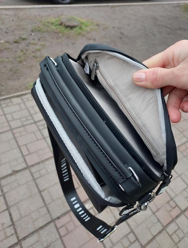 Имеет 2 вместительных отделения + внутри дополнительные карманы для мелочей;С обратной стороны сумки карман на молнии;
