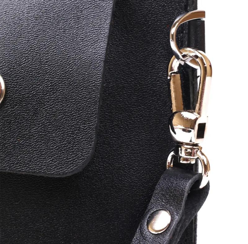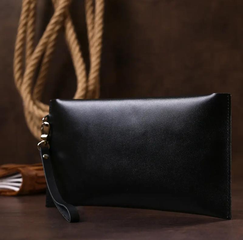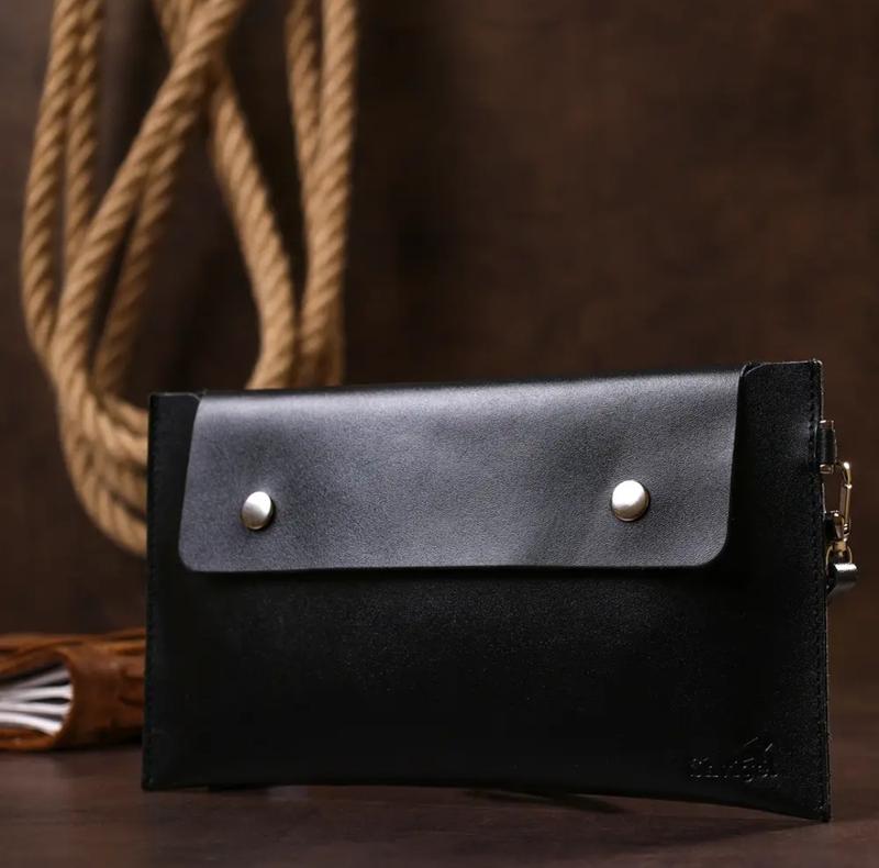 Отличная тревел-косметичка из гладкой натуральной кожи с высокими показателями устойчивости к износу. Имеет классический черный цвет, приятную на ощупь фактуру и фурнитуру в цвете под серебро. Закрывается аксессуар на две кнопки с клапаном. Ремешок на запястье также сделан из натуральной кожи. Такая косметичка станет хорошим подарком близкому человеку.