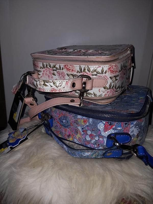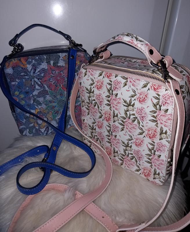 Яркие , акцентные сумки -коробочки, квадратной формы из натуральной кожи , цветочного принта. Застежка на две молнии, два отделения, внешний карман на молнии. фурнитура - серебро, четыре металлические ножки. Две ручки. одна короткая, другая длинная, съемная и регулируется. Жесткой формы. Розовая- гладкая кожа. Синяя- лазерная обработка. Состояние идеальное. Не использовались. Сумочки одинаковой формы, отличаются цветом и способом обработки кожи. Можно купить набором , можно и одну.