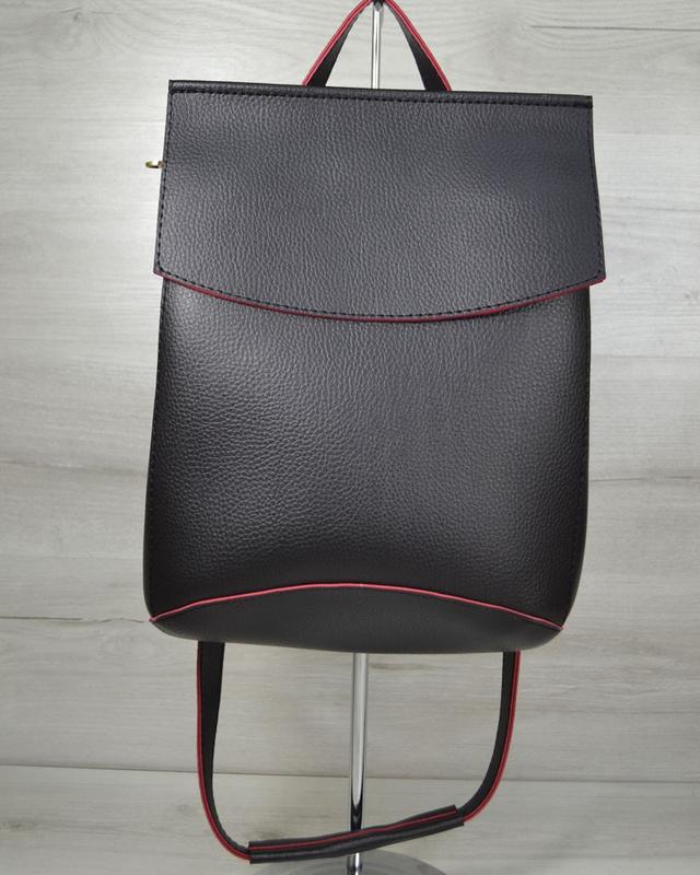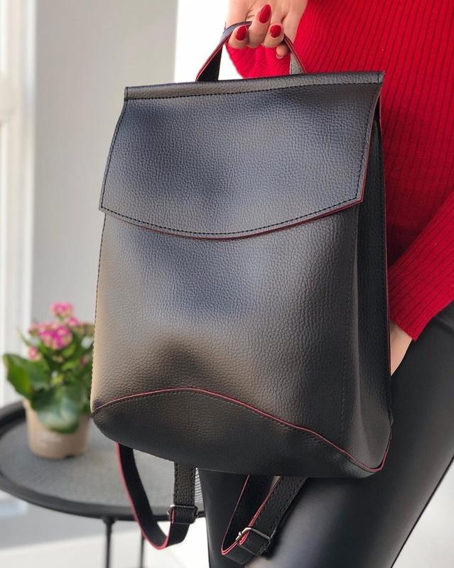 Эко-кожа высокого качества. Основное отделение застегивается на застежку-молнию, на боковых частях сумки установлены кнопки для максимального закрывания сумки. Внутри есть нашитая косметичка, а также два кармана для мелких предметов. Есть внешний карман на застежке для мелких предметов. Ремешки регулируются с помощью протяжек из рюкзака в сумку. Размер: