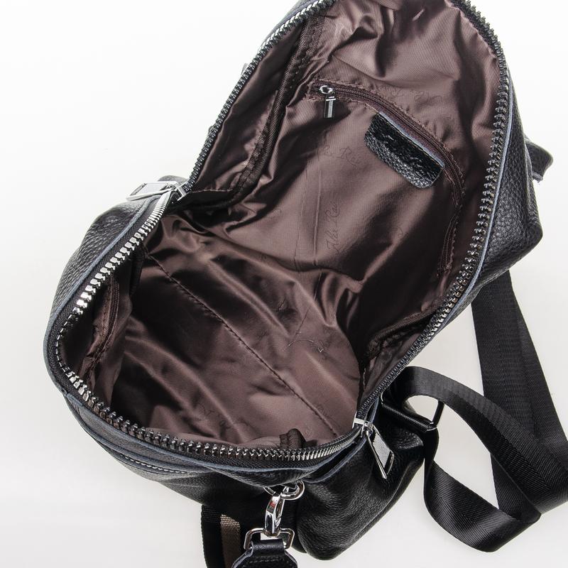 . Изготовлена из натуральной мягкой кожи. Можно носить на плече на широком ремне. Закрывается на молнию. Внутри находится основное и дополнительное отделение, разделенное карманом-перегородкой на молнии и карман на молнии. Снаружи рюкзака на фасаде и обратной стороне расположены карманы на молнии. На торцах рюкзака есть небольшие открытые карманы. Плечевые лямки регулируются по длине.