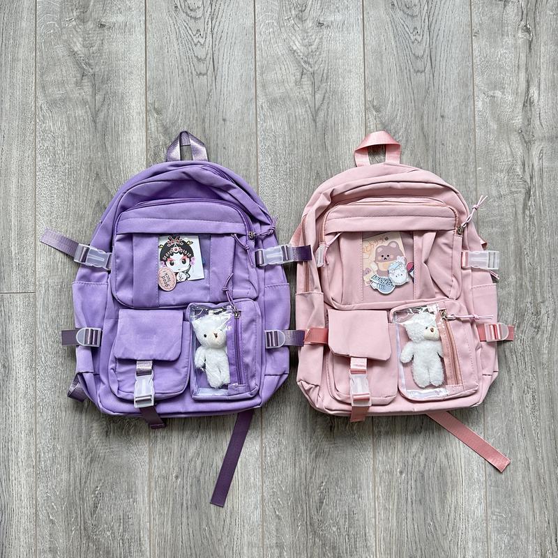 Новые рюкзаки с значками и подвесками с медведиками. В наличии есть черный, розовый, синий и фиолетовый.Размер 41*30*13 см