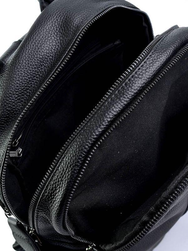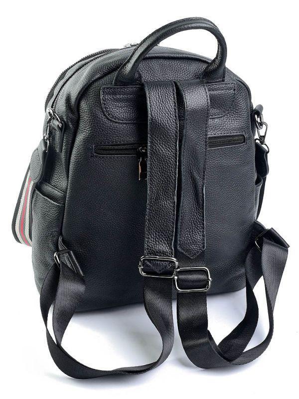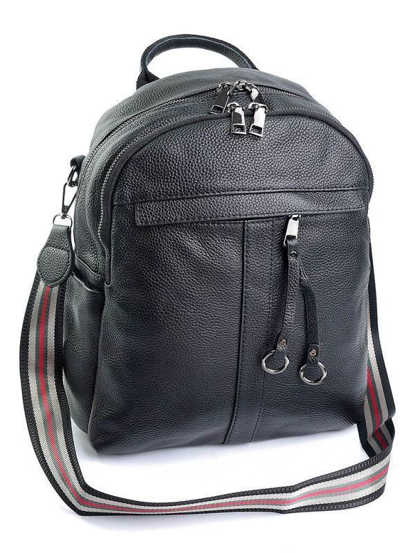 Женская кожаная сумка-рюкзак. Два отделения на молнии. Внутри одного отделения открытый карман и карман на молнии. На фасаде карман на молнии. По бокам открытые карманы. С тыльной стороны карман на молнии. В комплекте есть длинный ремень. Фурнитура черн
