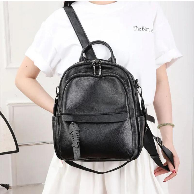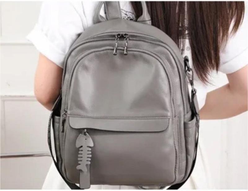 Рюкзак выполнен из натуральной кожи с применением надежной фурнитуры. Рюкзак имеет два отделения на молниях, в середине расположены карманы на молнии и открытый. На тыльной и лицевой стороне также есть карманы на молниях. По бокам рюкзака небольшие открытые карманы.